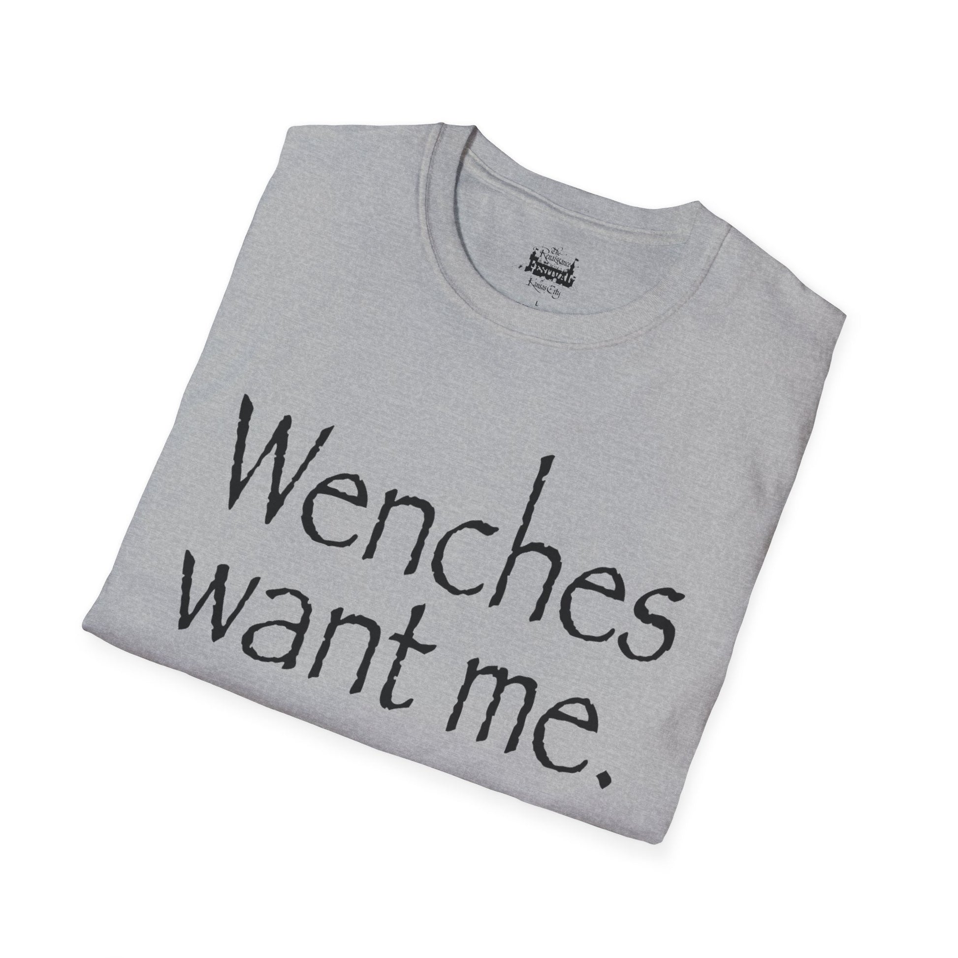 Step into the Renaissance fair with swagger in this playful white cotton t-shirt! Featuring bold, medieval-inspired lettering that declares "Wenches Want Me," this cheeky design is perfect for knights, jesters, and lords who want to bring some humor to the Renaissance festival scene.